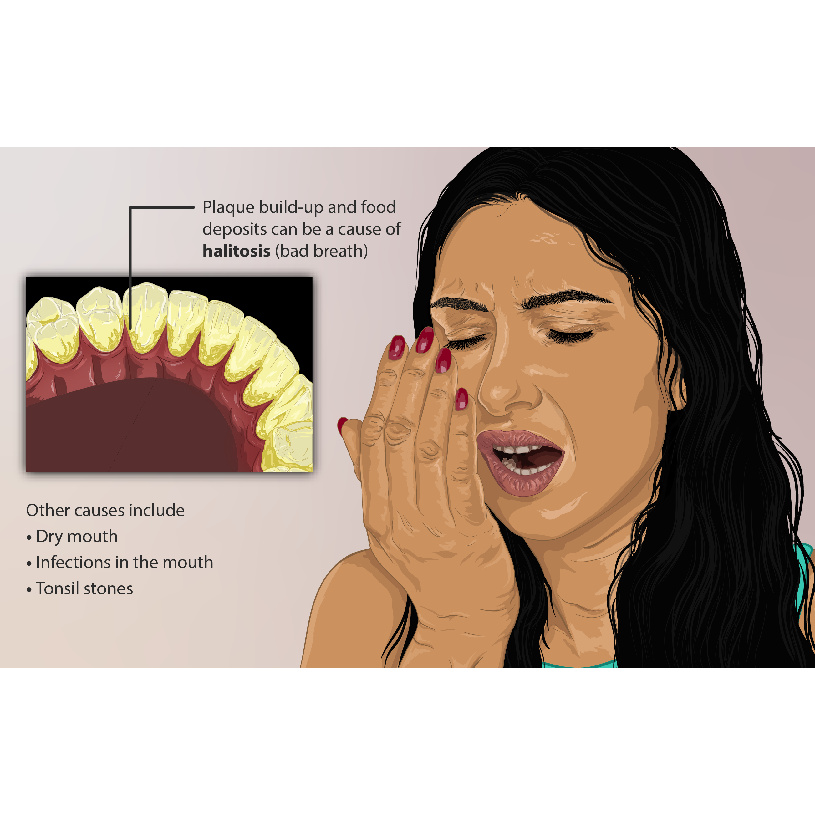 "Bad beading mouth" is not a standard medical term, but likely refers to bad breath (halitosis) or a...